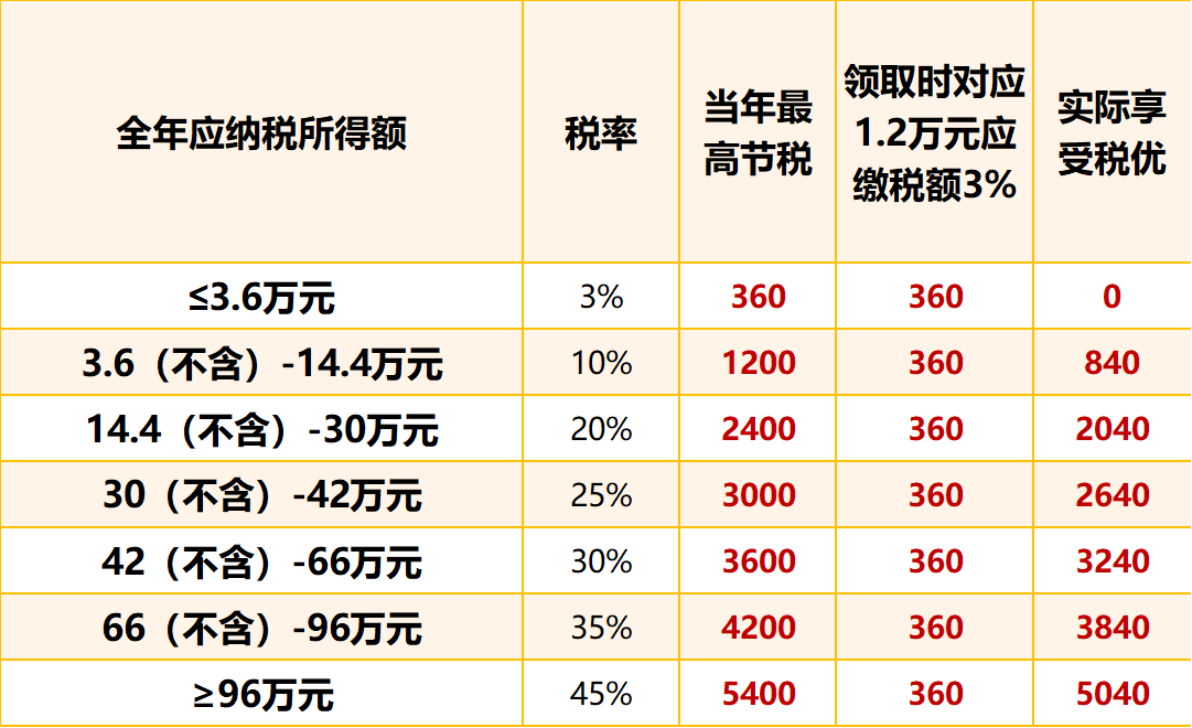 我们举例说明:假设您2025年全年应纳税所得额处于144000元—300000 元区间,对应税率20%。若当年缴存12000元个人养老金,当期可直接少缴个税:12000×20%=2400元。未来领取这12000元时,仅需按3%缴税,即12000×3%=360元。仅从本金部分计算,即可净省2040元。收入越高、适用税率越高,当期节税效果越明显,按最高 45% 税率计算,当期最高可节税5400元。这正是通过税收优惠,鼓励个人为未来养老提前储备的政策红利。